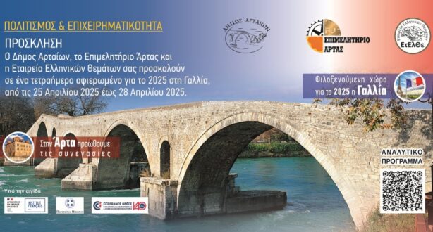 Μια τετραήμερη δραστηριότητα με τίτλο «Πολιτισμός και Επιχειρηματικότητα» και με τιμώμενη χώρα για το 2025 τη Γαλλία, πρόκειται να πραγματοποιηθεί στην πόλη της Άρτας, από την Παρασκευή 25 Απριλίου 2025 έως και τη Δευτέρα 28 Απριλίου 2025.