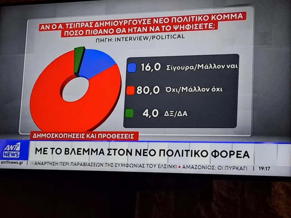 Στο ερώτημα αν θα ψήφιζαν ένα νέο κόμμα του Αλέξη Τσίπρα, οι 8 στους 10 λένε «όχι ή μάλλον όχι», ενώ ένα υπολογίσιμο 16% απαντά «σίγουρα ναι ή μάλλον ναι».