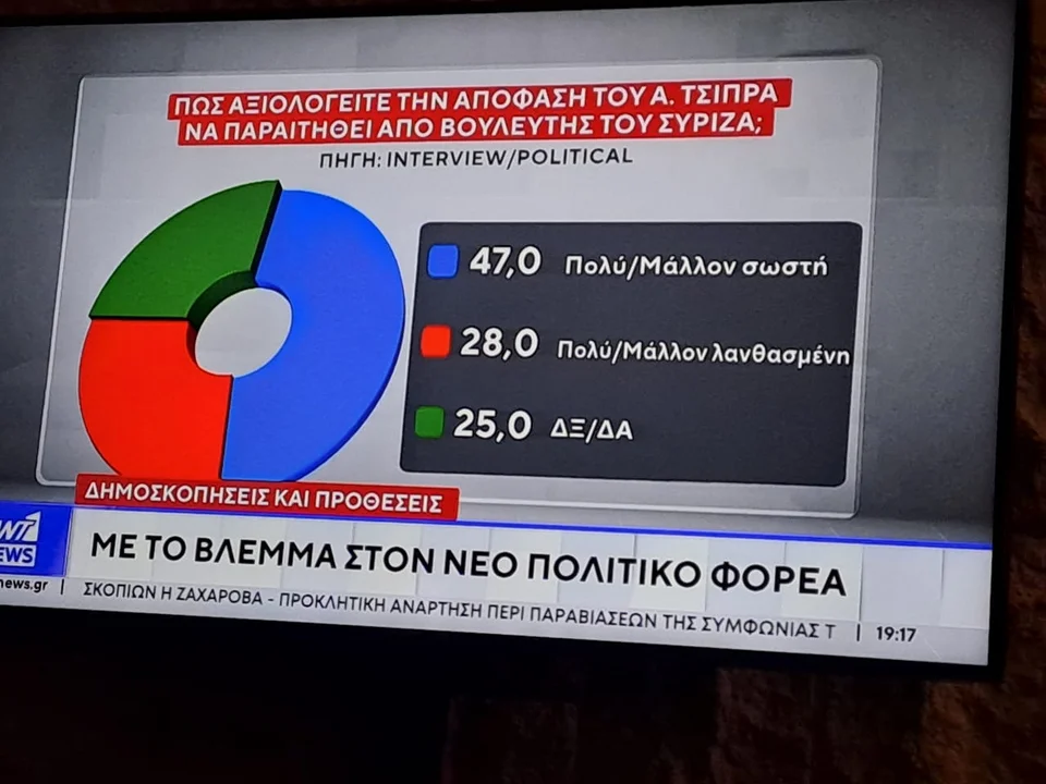 Στη δημοσκόπηση οι ερωτηθέντες ρωτήθηκαν και για την κίνηση του Αλέξη Τσίπρα να παραιτηθεί από βουλευτής του ΣΥΡΙΖΑ, και σχεδόν ένας στους δύο (47%) λέει πως έπραξε σωστά, ενώ το 28% τη χαρακτηρίζει λάθος και ένα 25% δεν έχει ξεκάθαρη γνώμη.