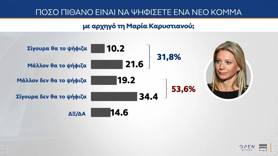 Σε καλύτερη μοίρα βρίσκεται η Μαρία Καρυστιανού, καθώς μόλις το 53,6% δεν θα ψήφιζε ένα κόμμα με την ίδια αρχηγό.