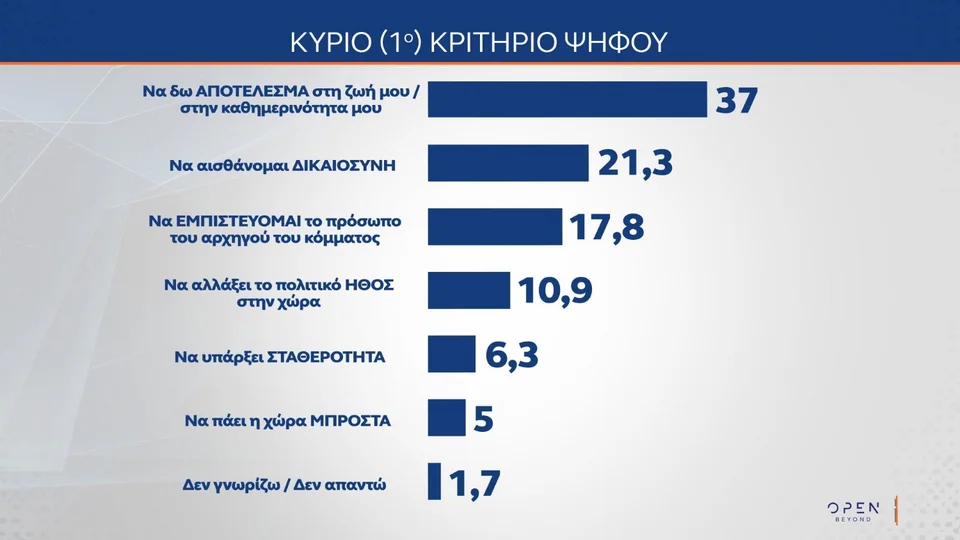 Την ίδια ώρα, ο Κυριάκος Μητσοτάκης θεωρείται καταλληλότερος πρωθυπουργός με 24,1%, με τους αντιπάλους του να βρίσκονται κάτω από το 10%.