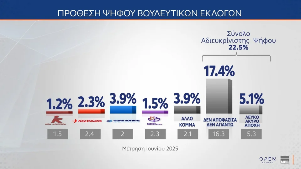 Όσον αφορά την πρόθεση ψήφου, η ΝΔ είναι στο 22,6%, το ΠΑΣΟΚ στο 10,9%, η Ελληνική Λύση στο 9,1%, η Πλεύση Ελευθερίας στο 7,5%, το ΚΚΕ στο 6,7%, ο ΣΥΡΙΖΑ στο 6% και η Φωνή Λογικής στο 3,9%.