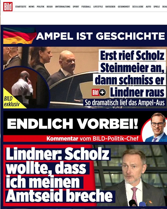 «Επιτέλους τέλος!», συνοψίζει η Bild θυμίζοντας ότι επί μήνες ο συνασπισμός του Όλαφ Σολτς «κρατούσε τη χώρα σε αγωνία –αλλά μόνο υπό την έννοια των καβγάδων και της δυσαρέσκειας» και σημειώνοντας ότι η κυβέρνηση δεν ανταποκρίθηκε σε καμία περίπτωση στο πραγματικό της καθήκον, να οδηγήσει την Γερμανία έξω από την κρίση. «Αντιθέτως: τα κόμματα της συγκυβέρνησης οδήγησαν την χώρα ακόμη πιο βαθιά σε ένα χάος μέσω της γκρίνιας και των συνεχών αλληλοκατηγοριών». Στο τέλος ο Κρίστιαν Λίντνερ, συνεχίζει η ταμπλόιντ, «μάζεψε το απαραίτητο θάρρος ώστε να τελειώσει το κόκκινο-κίτρινο-πράσινο δράμα. Άνοιξε τον δρόμο για μια νέα αρχή και έκανε αυτό που η πλειοψηφία των πολιτών απαιτούσε εδώ και καιρό από τα φανάρια: τράβηξε την πρίζα». Από τη μια είναι κατανοητό ότι ο κ. Σολτς επιτίθεται πλέον τόσο έντονα στον κ. Λίντνερ. Άλλωστε ο συνασπισμός είναι ιστορία. Και ο καγκελάριος Σολτς επίσης, υποστήριξε η εφημερίδα.
