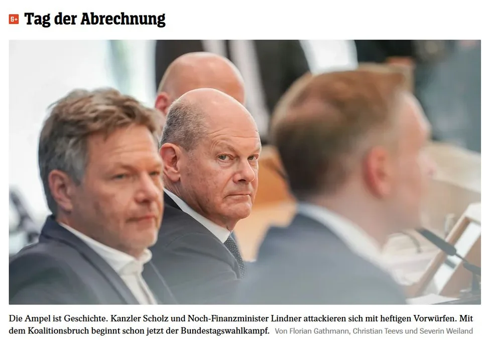 Ο κόσμος στην Γερμανία «είχε από καιρό χορτάσει από τη συμμαχία αυτών των ανισοτήτων, των ερωτευμένων με τα επιχειρήματα και των εμμονικών με την ηθική. Ποτέ άλλοτε ομοσπονδιακός καγκελάριος δεν κατάφερε να καταστρέψει την εμπιστοσύνη που του δόθηκε με τόσο διαρκή τρόπο μέσα σε τόσο σύντομο χρονικό διάστημα», έκρινε το Focus περιγράφοντας τον Όλαφ Σολτς με όρους όπως «αποκομμένος» και «αποξενωμένος από την πραγματικότητα», καθώς «αρνείται πεισματικά και αλαζονικά την προσωπική του ευθύνη για την δική του πολιτική αποτυχία».